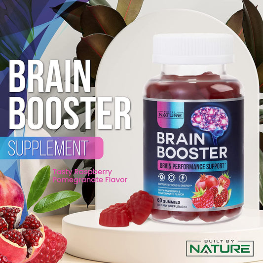 Brain Booster Gummies Supplement Nootropic with Phosphatidylserine, Coffee Bean Extract and Vitamin B12 to Support Focus, Memory, Energy and Brain Performance, Tasty Raspberry Gummy Flavor, 60 Gummies