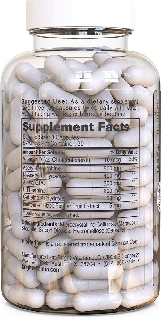 Bright Vitamin Nootropic Supplement and Brain Booster Mental Sharpness, Focus, Energy, Memory and Mood Balance Alpha GPC, L-Theanine, ALCAR, NALT, Vitamin D 90 Capsules