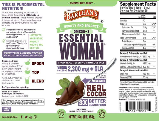 Barlean's Essential Woman Chocolate Mint Blend from Flax Oil with Omegas 3, 6 and 9 and GLA - Vegan, Non-GMO, Gluten Free - 16-Ounces