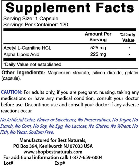 Best Naturals Acetyl L-Carnitine and Alpha Lipoic Acid 750 mg 120 Capsules (120 Count (Pack of 2))