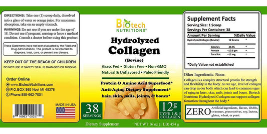 Biotech Nutritions Hydrolyzed Collagen Grass Fed Nongmo Paleo Friendly Gluten Free Type 1 and 3, 16 Ounce