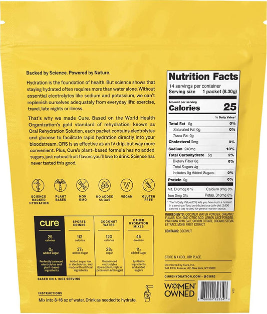 Cure Hydrating Electrolyte Mix | Electrolyte Powder for Dehydration Relief | Made with Coconut Water | No Added Sugar | Vegan | Paleo Friendly | Pouch of 14 Hydration Packets - Lemon Flavor