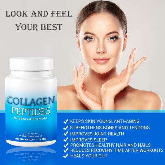 2 for 1 Promo Research Labs Collagen Peptides Capsules Grass Fed Anti-Aging Support for Skin, Joints, Tendons, Bones, Hair and Nails. Paleo Friendly