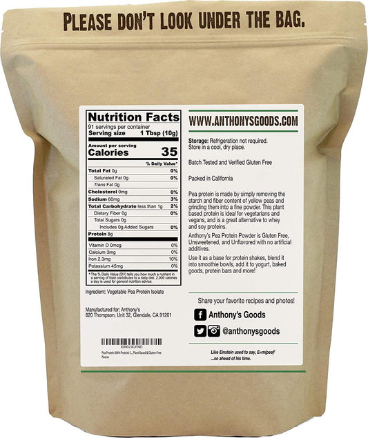 Anthony's Premium Pea Protein, 2 lb, Plant Based, Gluten Free, Unflavored, Vegan, Keto Friendly