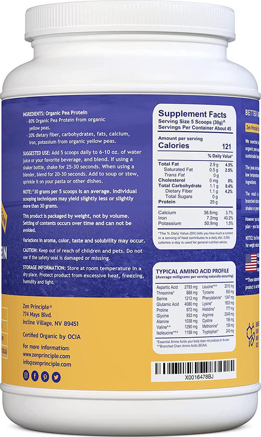 3 lb. Ultra Premium Organic Pea Protein Powder. USDA Certified ONLY from USA and Canada Grown Peas. No GMO, Soy or Gluten. Vegan. Full Spectrum Amino Acids (BCAA). More Protein than Whey. 80% Protein.