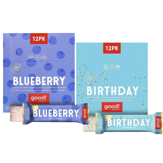 good! Snacks Vegan Protein Bars Bundle, Blueberry and Birthday Cake (24 Bars) Gluten-Free, Plant Based, Low Sugar, High Protein Meal Replacement, Healthy Snacks for Energy, 15g Protein