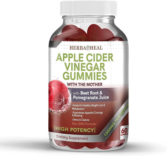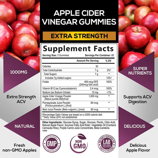 Apple Cider Gummies 1000Mg - Made with Apple Cider Vinegar Powder, Folic Acid, Vitamin B12, Vitamin B6, Iodine, Beet Juice Powder, Pomegranate Juice Powder - 60 Gummies