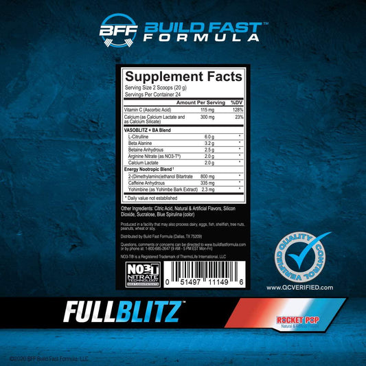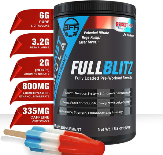 FULLBLITZ by BFF Build Fast Formula | Fully Loaded Pre-Workout | Energy Booster + Huge Dual Pathway Nitric Oxide Boosting Muscle Pumps, Laser Focus and Nootropic Blend 24 Workouts (Rocket Pop)