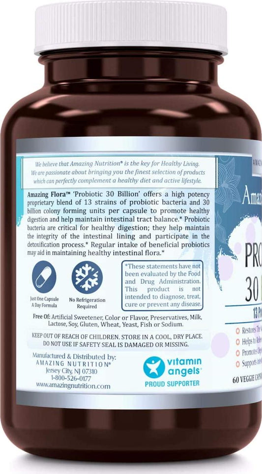 Amazing Flora Probiotic 13 Strains, 60 Veggie Capsules *Promotes Digestive and Immune Health *Supports Intestinal Health *Restores Natural Balance of Good Bacteria (30 Billion)