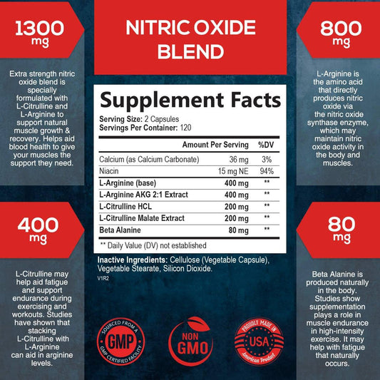 Extra Strength Nitric Oxide Supplement L Arginine 3X Strength - Citrulline Malate, AAKG, Beta Alanine - Premium Muscle Supporting Nitric Oxide Booster for Strength & Energy Supplements - 60 Capsules