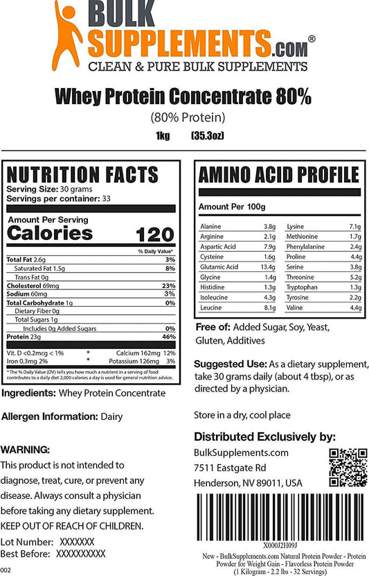 BulkSupplements.com Whey Protein Concentrate - Whey Protein Powder - Protein Powder Unflavored - Low Calorie Protein Powder - Protein Powder for Muscle Gain (1 Kilogram - 2.2 lbs)