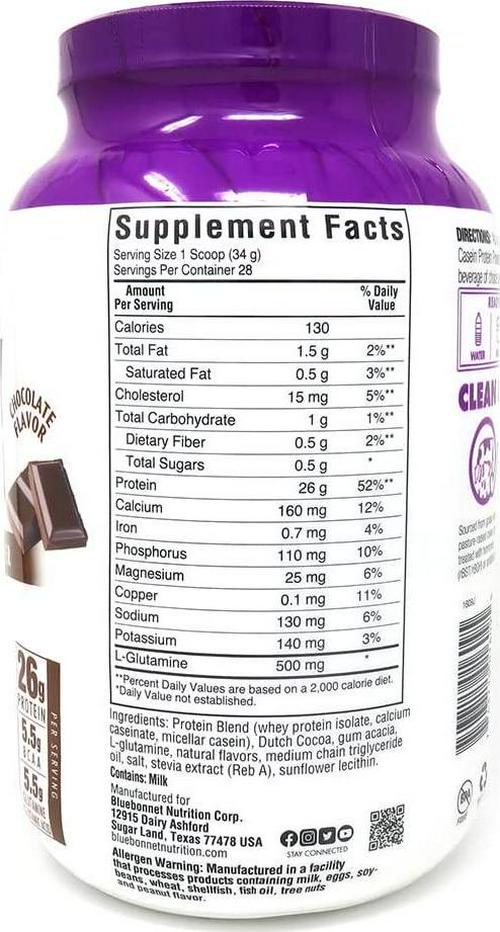 Bluebonnet Nutrition Whey and Casein Protein Powder, Whey from Grass Fed Cows, 26 Grams of Protein, No Sugar Added, Non GMO, Gluten Free, Soy Free, Kosher Dairy, 2.1 lbs, 28 Servings, Chocolate Flavor