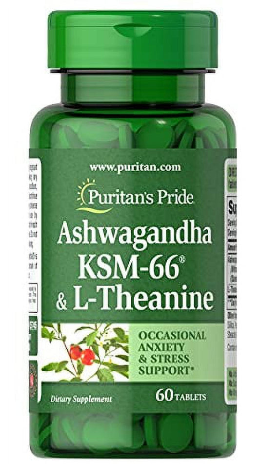 Ashwangandha KSM66 and L-Theanine, Helps Relieve occassional Stress and Anxiety, 60 Count by Puritan's Pride, White