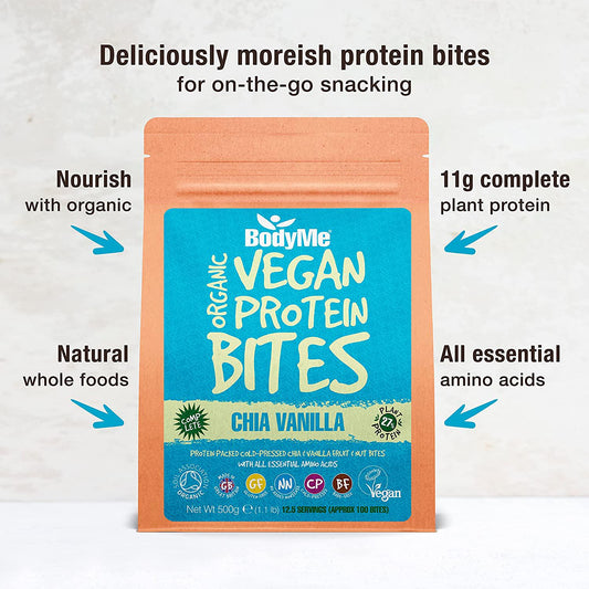 BodyMe Organic Vegan Protein Bites | Raw Chia Vanilla | 500g (100 Bites) | With 3 Plant Proteins