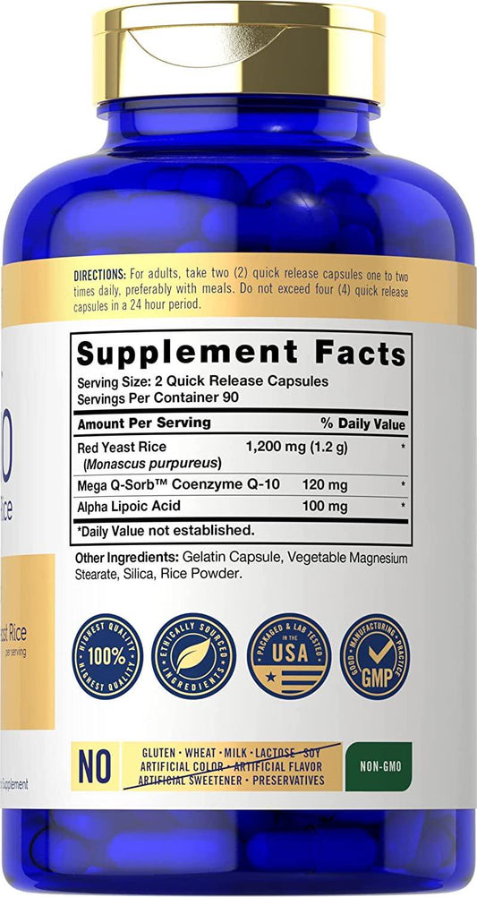 CoQ10 with Red Yeast Rice | 180 Capsules | Mega Q-Sorb 120mg and Red Yeast Rice 1200 mg | Non-GMO, Gluten Free Supplement | by Carlyle