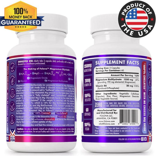 Folona Magnesium Glycinate with Vitamin B6 to Enhance Absorption - 1350mg Fully Chelated, Supports Sleep, Relaxation, Stress Relief, Energy, Muscle Cramps, Gluten Free, Non-GMO, 180 Vegan Capsules