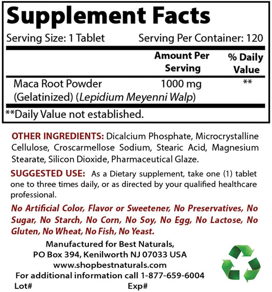 Best Naturals Gelatinized Maca 1000mg per Tablet (Non-GMO), Supports Reproductive Health, Mood, Hormonal Balance, Cardiovascular Health and Immune Health*, 120 Count