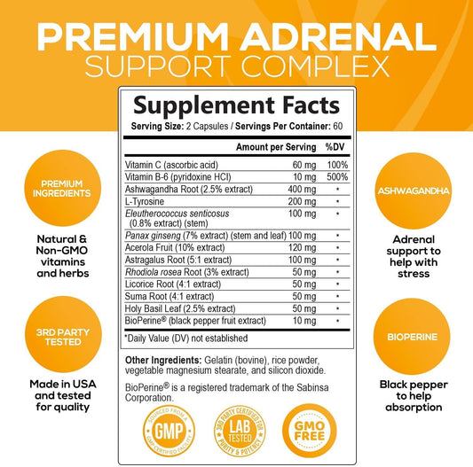 Adrenal Support and Cortisol Manager for Adrenal Fatigue, Stress Relief, Anxiety, Focus, Brain Fog with Ashwagandha Rhodiola Rosea, Ginseng, L-Tyrosine and More Adaptogen Blend 60 Non GMO Capsules