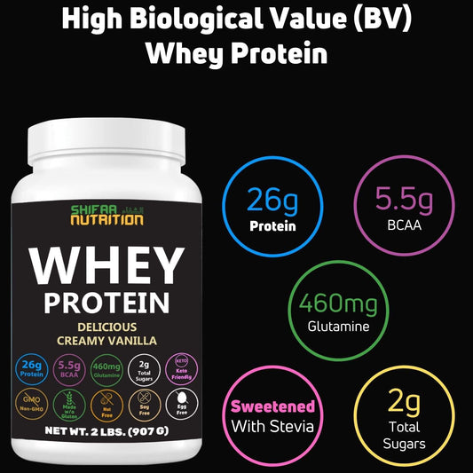 Delicious Creamy Vanilla Halal Whey Protein Powder 2Lbs | 26g Protein, 5500mg BCAAs, and 460mg Glutamine | for Recovery and Lean Muscles | Gluten-Free | Non-GMO | Keto-Friendly | by SHIFAA NUTRITION