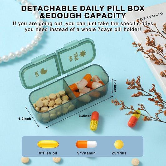 AOWOO Pill Organizer 2 Times a Day, 7 Day Am Pm Pill Box - Weekly Pill Organizer with Separate Container, Portable Daily Medicine Planner Dispenser Case for Vitamin, Fish Oils, Supplements(Green)