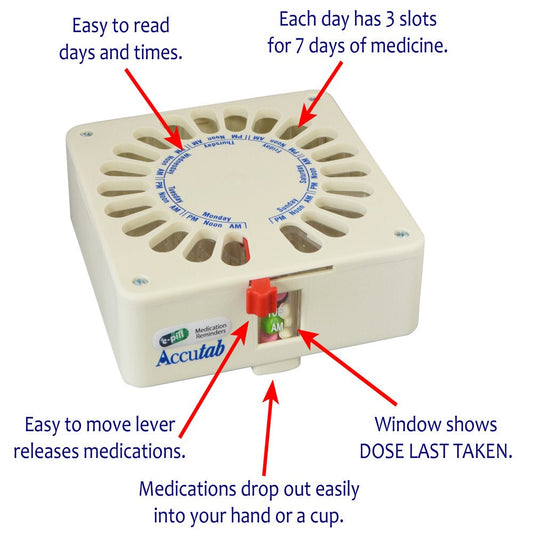 E-Pill Accutab - Manual Pill Dispenser - 7 Day X 3 Compartments per Day – Large Capacity. Bonus Filling Tray