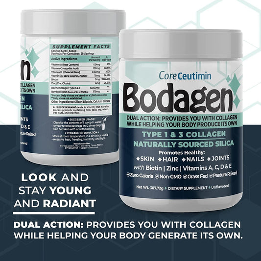 Bodagen - Collagen Peptides with Silica – Provides Collagen While Stimulating Your Body to Make its Own - Includes Biotin, Zinc, Vitamins A, C, D, and E - Zero Calories - Unflavored - by Coreceutimin