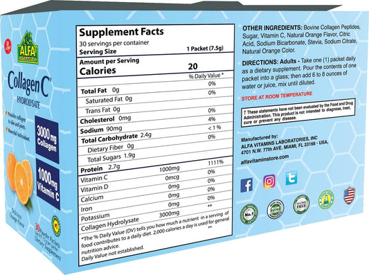 CollagenC Collagen Peptides Hydrolysate Powder Supplement - Premium Quality Source of Antioxidants - for Immune Support, Skin, Hair, Nails and Joints support - 30 Packets