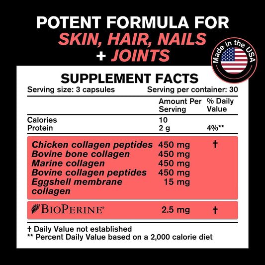 Collagen Pills - Multi Collagen Supplements (Types I, II, III, V and X) Collagen peptides Pills for Hair, Skin and Joints - hydrolyzed Collagen Protein Powder (Colageno) Collagen Capsules for Women and Men