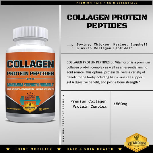 Collagen Protein Peptides - Max Strength Hydrolyzed Collagen Peptides - Pure Marine, Bovine, Eggshell Peptide Capsule Complex - Best for Keto, Skin, Hair, Bone, Joint, Digestion by Vitamorph - 90 Caps