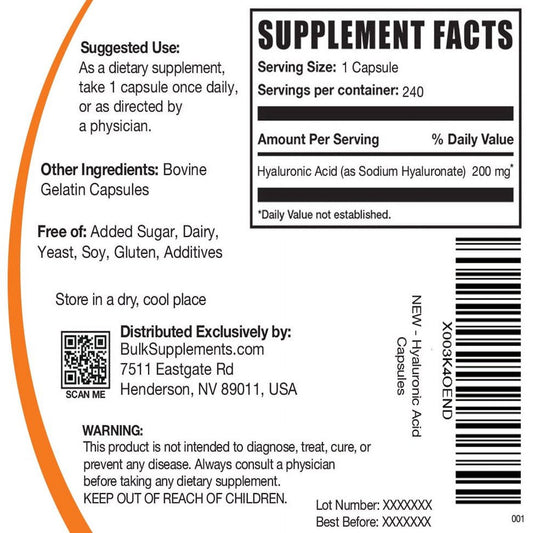 Bulksupplements.Com Hyaluronic Acid Capsules, 200Mg - Joint Supplements - Pure Hyaluronic Acid (240 Gel Capsules - 240 Servings)
