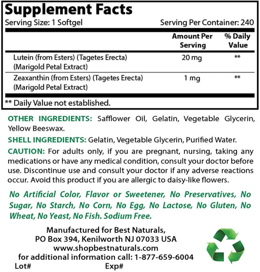 Best Naturals Lutein 20mg With Zeaxanthin, 240 Count