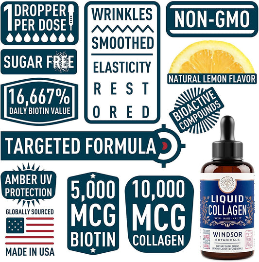 Concentrated Liquid Collagen Peptides Supplement - Hair, Skin, Nail, Joints Support - Sublingual Drops by Windsor Botanicals - 10,000mcg Collagen, 5,000mcg Biotin - Lemon Flavor - 2-Month - 2 oz