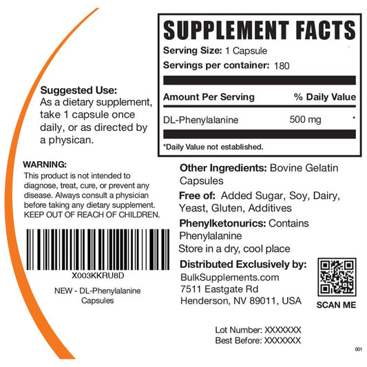 Bulksupplements.Com Dl-Phenylalanine Capsules, 500Mg - Brain, Liver, & Skin Support Supplements (180 Gel Caps - 180 Servings)