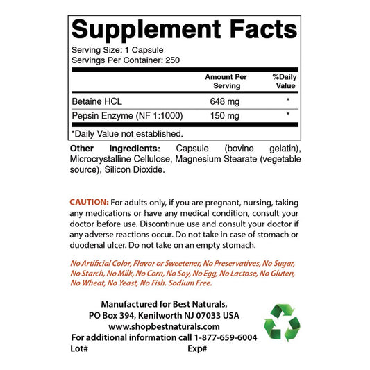 2 Pack Best Naturals Betaine HCL 648 Mg 250 Capsules
