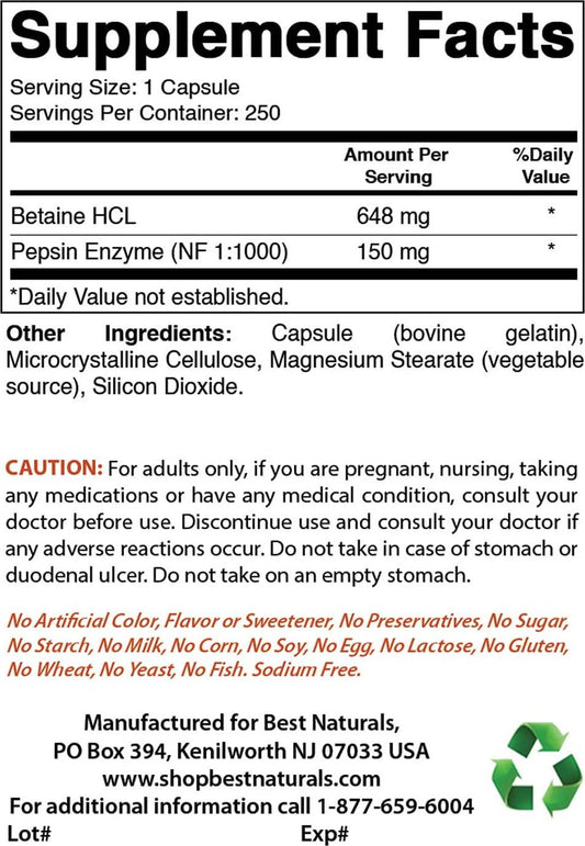 Best Naturals Betaine HCL 648 mg 250 Capsules