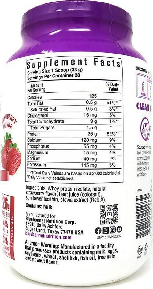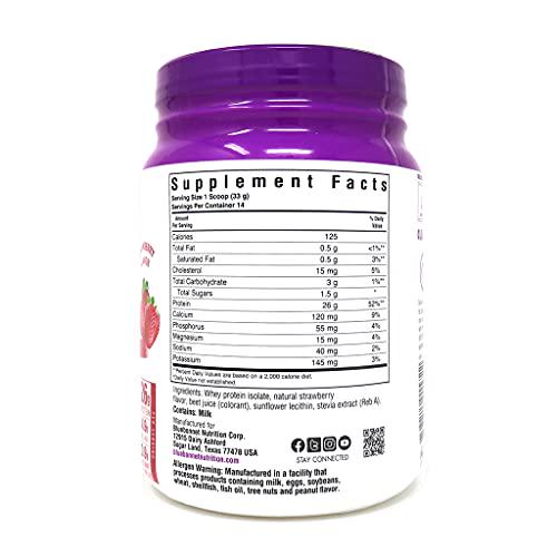 Bluebonnet Nutrition Whey Protein Isolate Powder, Whey From Grass Fed Cows, 26g of Protein, No Sugar Added, Non GMO, Gluten Free, Soy free, kosher Dairy, 2 Lbs, 28 Servings, Strawberry Flavor