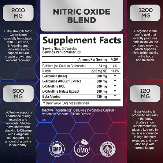 Extra Strength Nitric Oxide L-Arginine Supplement 2010mg - Citrulline Malate, AAKG, Beta Alanine - Premium Muscle Support Nitric Oxide Booster for Strength and Energy to Train Harder - 60 Capsule
