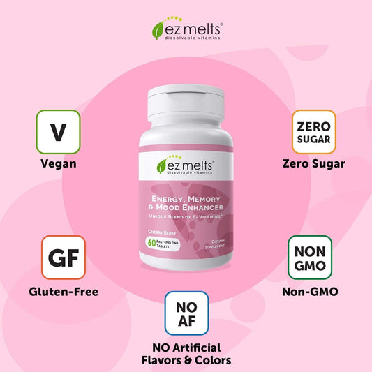 EZ Melts Energy Memory and Mood Enhancer, Methylated B-Complex, Sublingual Vitamins, Vegan, Zero Sugar, Natural Cherry Flavor, 60 Fast Dissolve Tablets