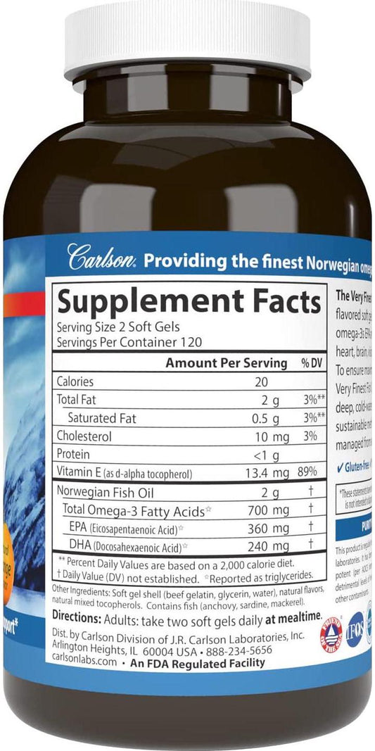 Carlson - The Very Finest Fish Oil, 700 mg Omega-3s, Norwegian, Wild-Caught Fish Oil, Sustainably Sourced Fish Oil Capsules, Orange, 240 Softgels