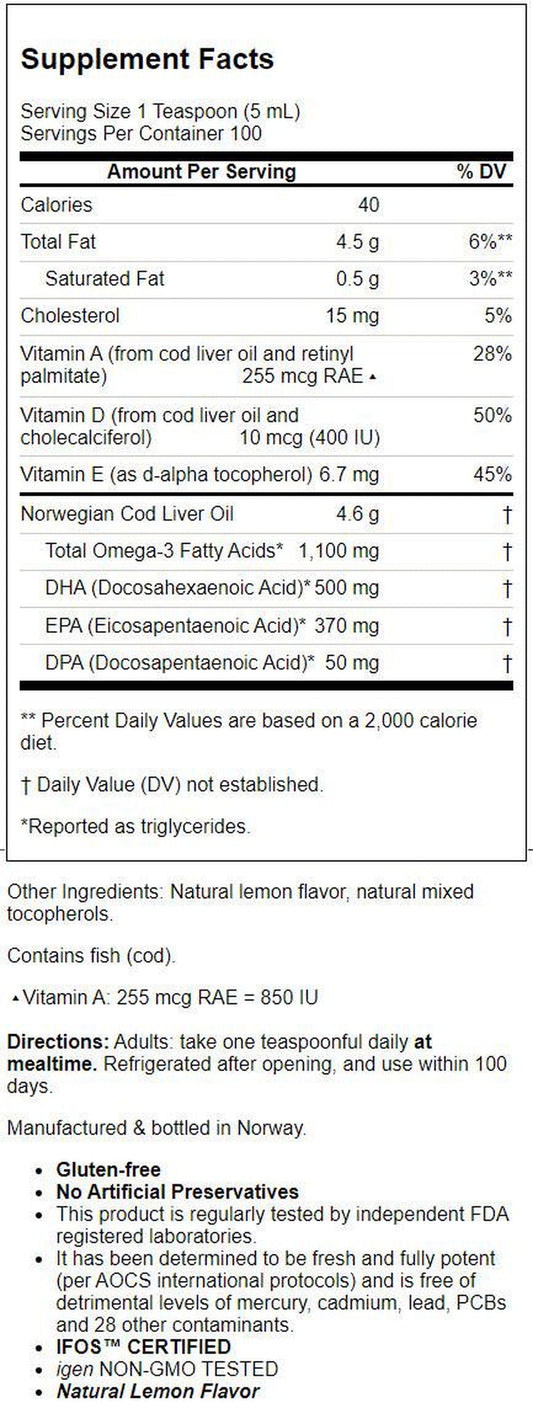Carlson Wild Norwegian Liquid Cod Liver Oil, 1100 Mg Omega-3S, 16.9 Fl Oz, Lemon