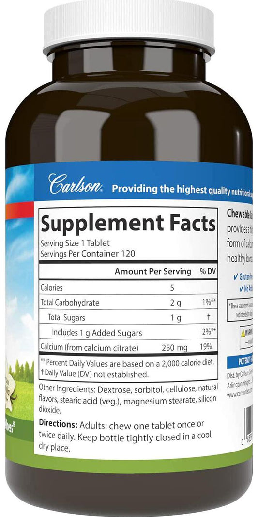 Carlson - Chewable Calcium Citrate, 250 mg Highly Absorbable, Bone Support, Healthy Teeth and Optimal Wellness, Vanilla, 120 Tablets