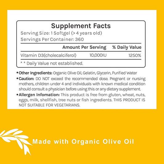 360 Softgels Vitamin D3 10,000 IU with Organic Olive Oil for Immune Support, Healthy Muscle, Bone and Teeth Health