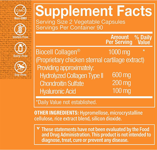 Biocell Collagen II with Hyaluronic Acid 1000mg, Supports Skin and Joint Health, Promotes Joint Comfort and Stimulates Cartilage Producing Cells (180 Vegetable Capsules) by The Vitamin Shoppe