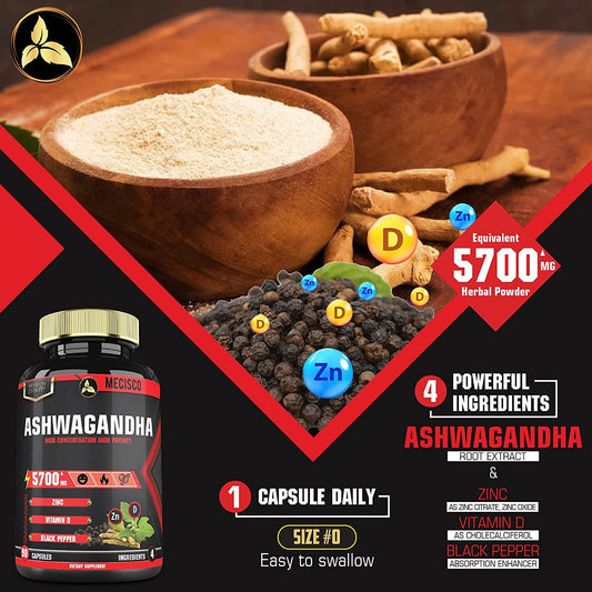 4in1 Organic Ashwagandha with Zinc, VitaminD and Black Pepper Equivalent 5700 mg Powder - Thyroid, Test, Immune Support - 90 Capsules - 3 Month Supply