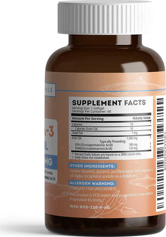 Fish Oil 1000mg with EPA/DHA and Omega-3 by Kate Natural. Triple Strength. Supports Heart Health. Non-GMO Formula. 60 Softgels (2 Bottles)