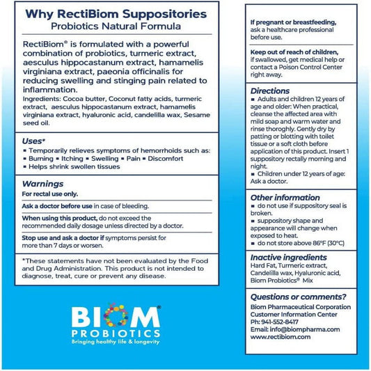 Biom Probiotics Rectibiom Probiotic Hemorrhoid Relief Suppositories, Natural Hyaluronic Acid Suppositories with Turmeric Extract, 15 Count