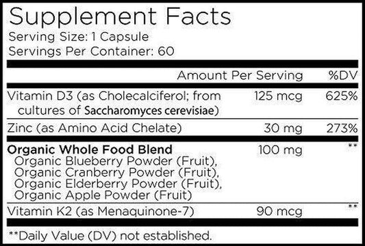 Amen Vitamin D, K2 and Zinc, Cholecalciferol D3 5000 IU, Organic Whole Food Blend with Apple, Blueberry, Cranberry, Elderberry Powder Fruits, Vegan Supplement, D3 K2 Vitamins, Non-GMO - 60 Capsules