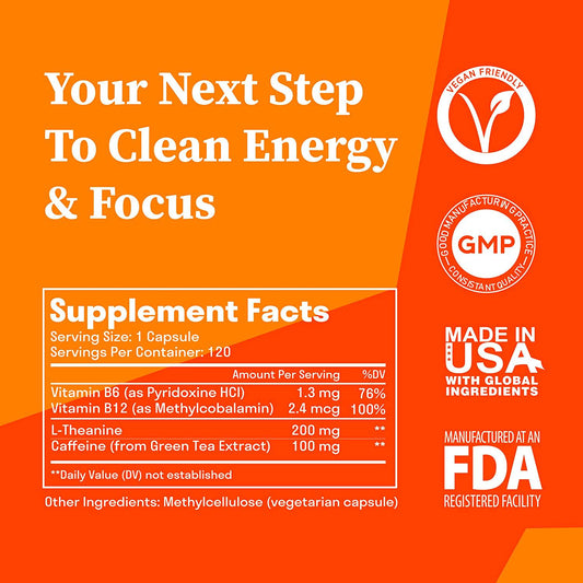 Aromatik Caffeine L-Theanine Focus Supplement | Caffeine (100 mg) + L-Theanine (200 mg) + B Vitamins | Energy Focus Cognition | USA Made at FDA Registered Facility | Vegan Capsules | 120 Servings