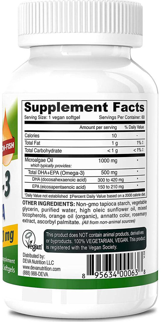 Deva Vegan Omega-3 DHA - EPA 500 mg Potency - Carrageenan Free - Non Fish - from Algae - 60 Vegetarian/Vegan Softgels, Manufactured in The USA**