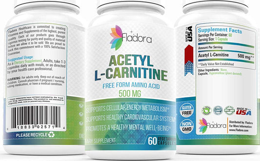 Acetyl L-Carnitine 500mg, Nootropic Supports High Energy Production, Cardiovascular Health and Cognition, Wholefood Dietary Supplement by Fladora, 60 Vegetarian Capsules, Non-GMO and Gluten Free